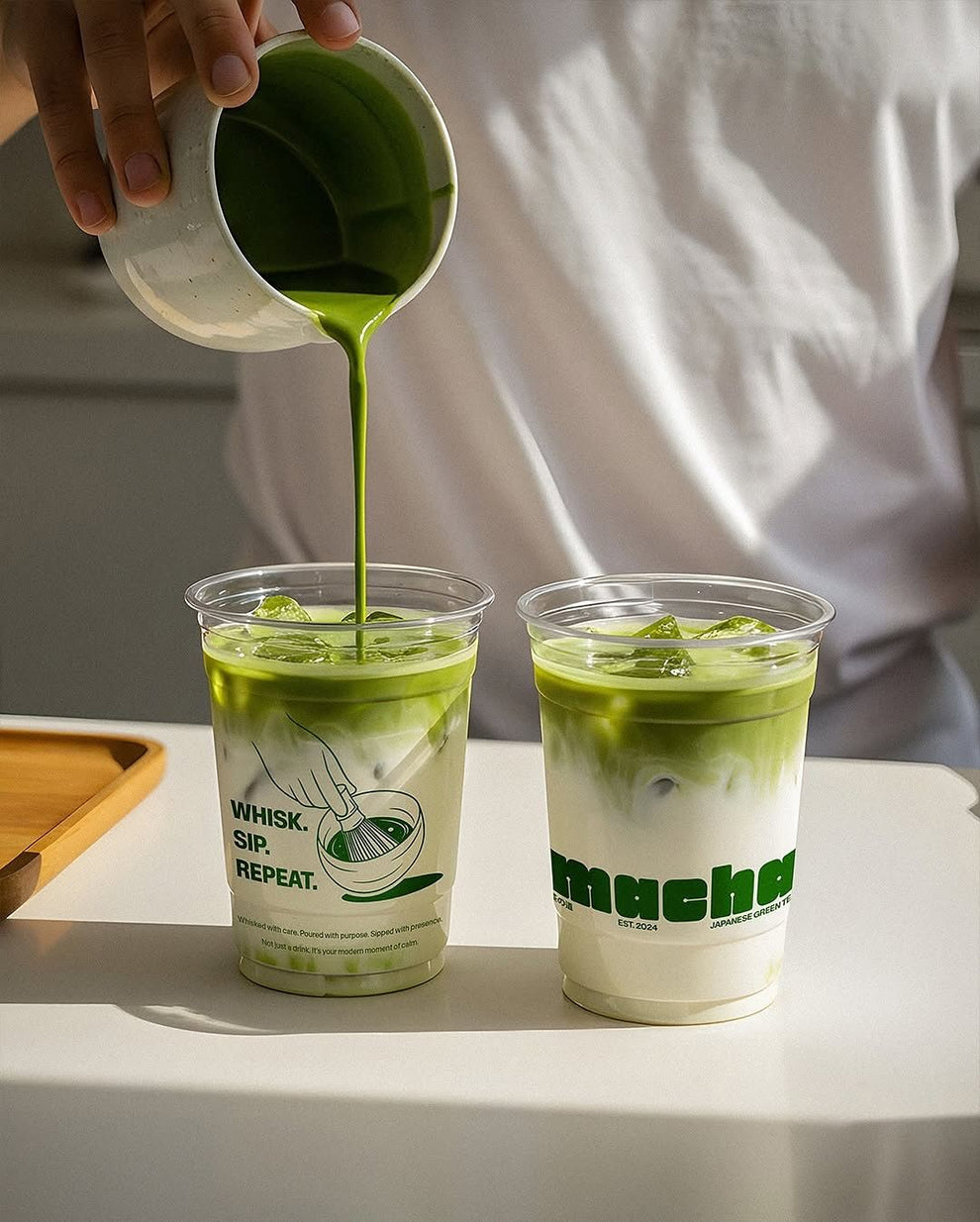 Matcha es una forma en polvo de té verde, en la que bebes hojas enteras molidas, y no solo la infusión. Gracias a esto, el organismo absorbe significativamente más antioxidantes, cafeína y clorofila, lo que se traduce en un mejor bienestar, energía natural y sensación de concentración. Es la esencia del té verde en su forma más intensa