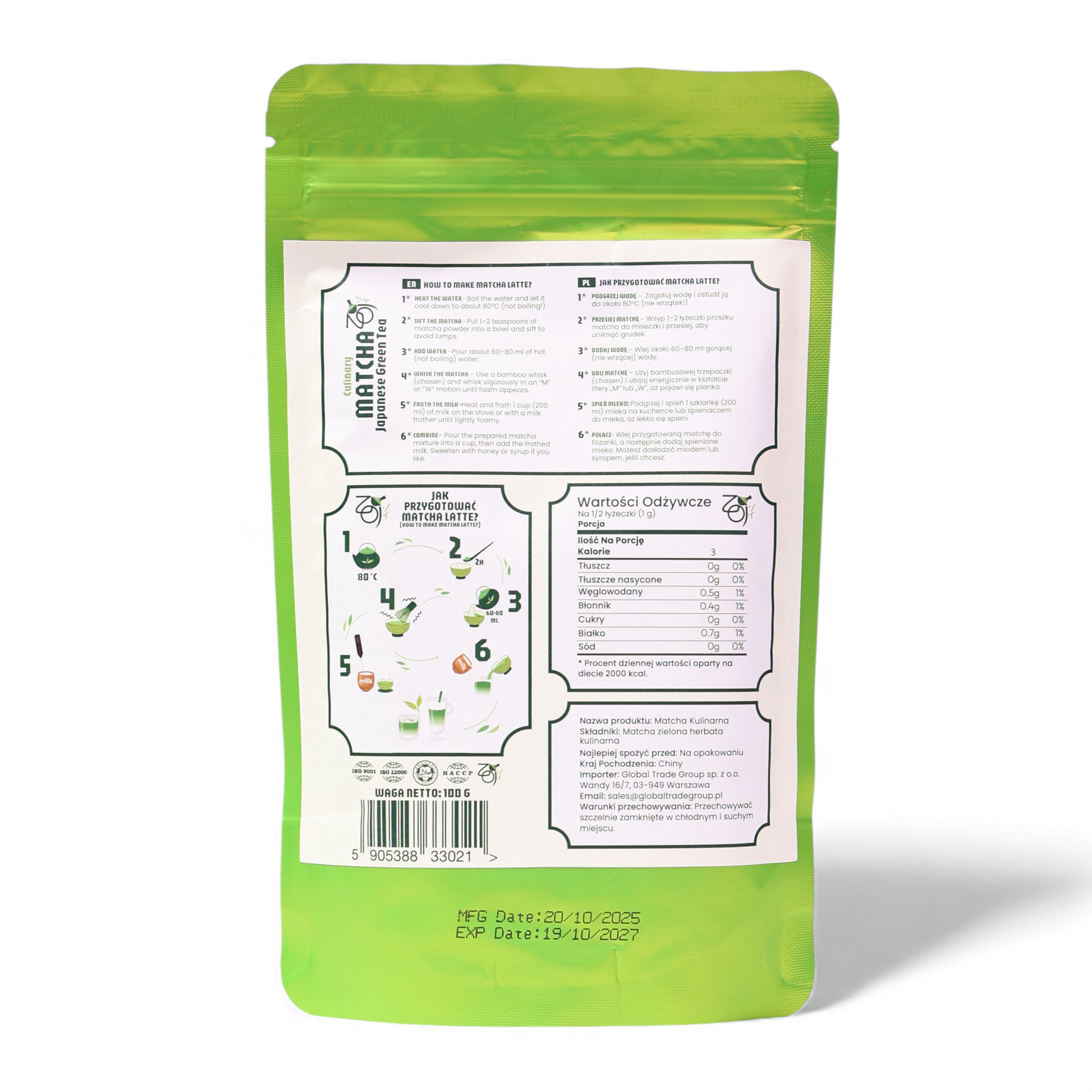 Matcha kulinarna ZOI, pozyskiwana z późniejszych zbiorów japońskiej odmiany krzewów uprawianych w Jingshan, Hangzhou, ma wyrazisty, roślinny smak z lekką goryczką, który idealnie łączy się z mlekiem. Jej intensywny charakter świetnie podkreśla napoje takie jak matcha latte oraz dodaje głębi deserom i smoothie.